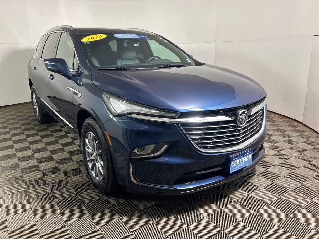 Certified. CARFAX One-Owner. 2023 Buick Enclave Essence Emperor Blue Metallic Buick Certified Pre-Owned Certified, AWD, Front & Rear Park Assist, Front Mounting License Plate Bracket Package, Heated Steering Wheel, Preferred Equipment Group 1SL.